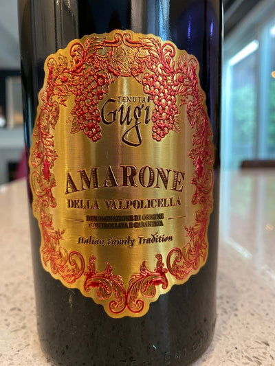 This wine is from the Valpolicella region of Italy. The grapes are harvested and left to dry for 90 days. They're fermented for 80 days, and aged in French oak barrels for 30 months. Tenuta Gugi, founded in the early 2000s, employs traditional methods with a respect for innovation. It has a deep ruby red color with orange shades. Some reviewers describe the wine as having raisin-like cherry flavors, delicate spices, notes of licorice and black pepper, intense aromas of dried berries and spices, with a soft, persistent flavor, and a lighter body than expected for an Amarone.